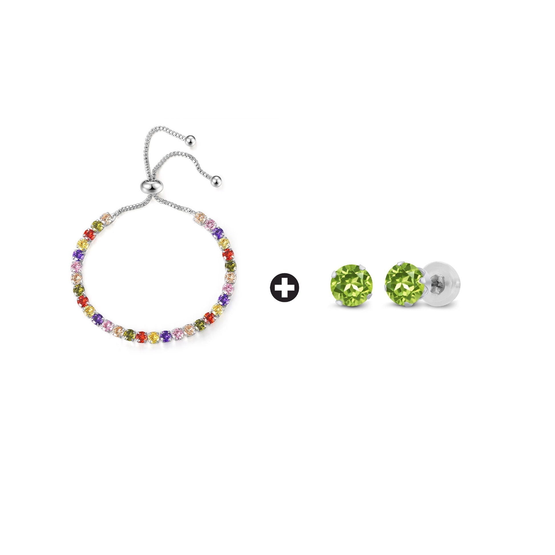 18k White Gold 6 Cttw Created Multi Color Round Adjustable Tennis Plated Bracelet and Earrings Set