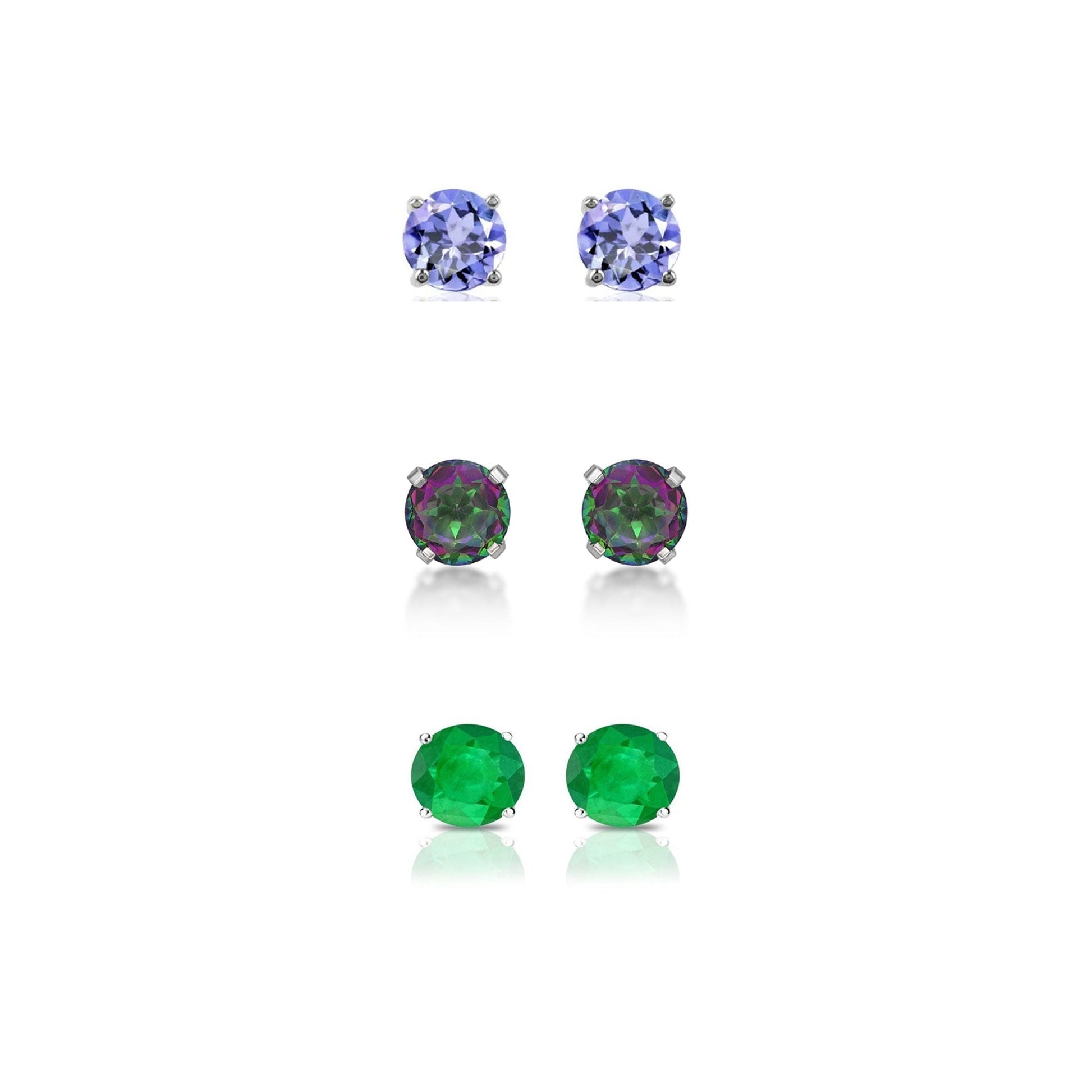 18k White Gold Plated 1/2Ct Created Tanzanite, Mystic Topaz and Emerald 3 Pair Round Stud Earrings