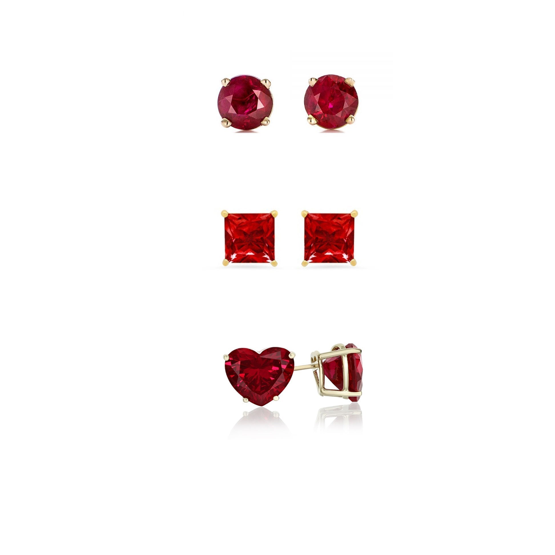 18k Yellow Gold Plated 1/4Ct 4mm Created Ruby 3 Pair Round, Square and Heart Stud Earrings