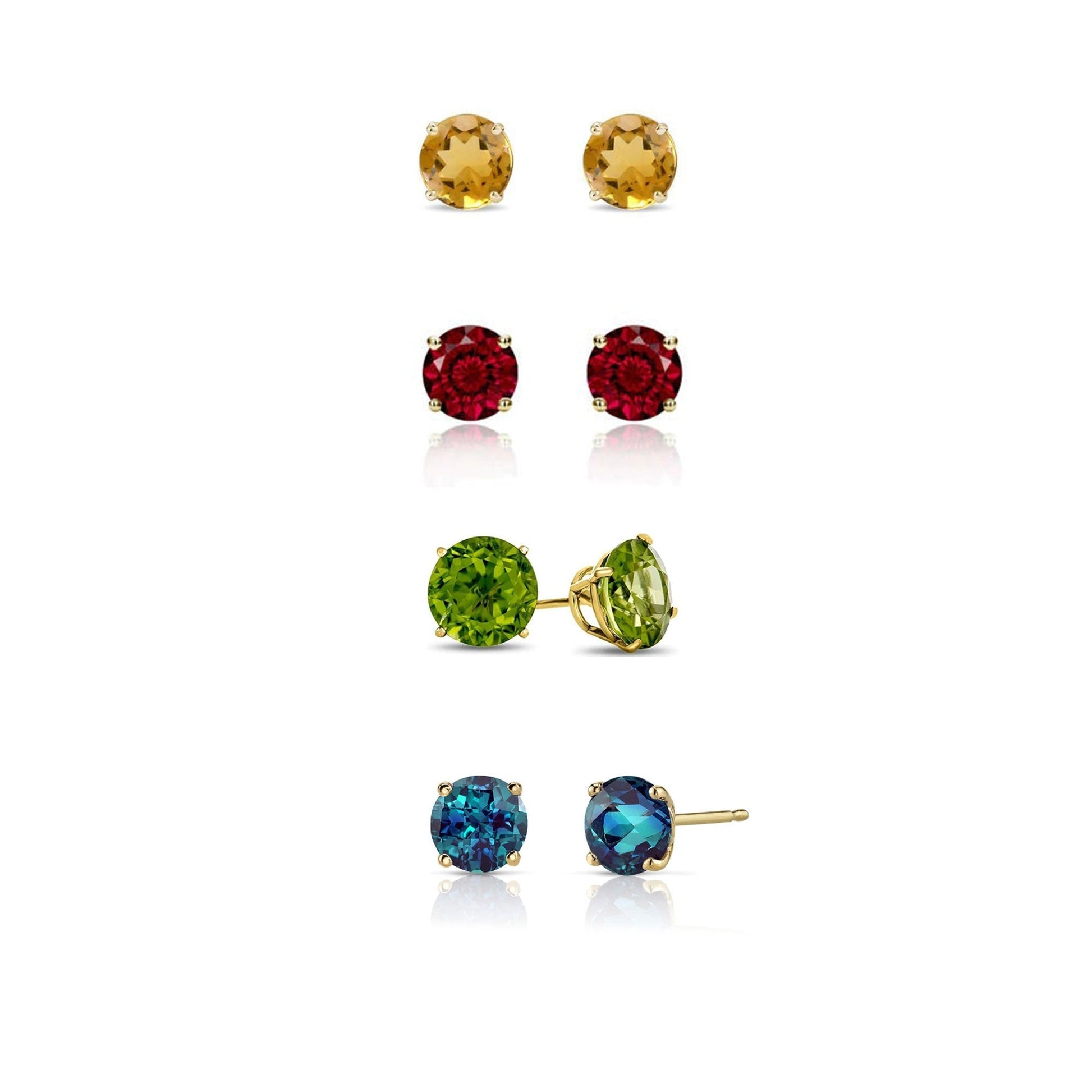 24k Yellow Gold Plated 1Ct Created Citrine, Garnet, Peridot and Alexandrite 4 Pair Round Stud Earrings