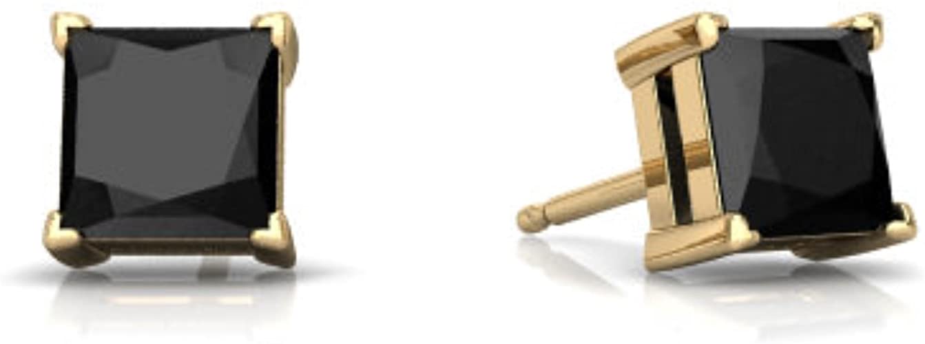 24k Yellow Gold Plated 2 Cttw Black Sapphire Princess Cut Stud Earrings
