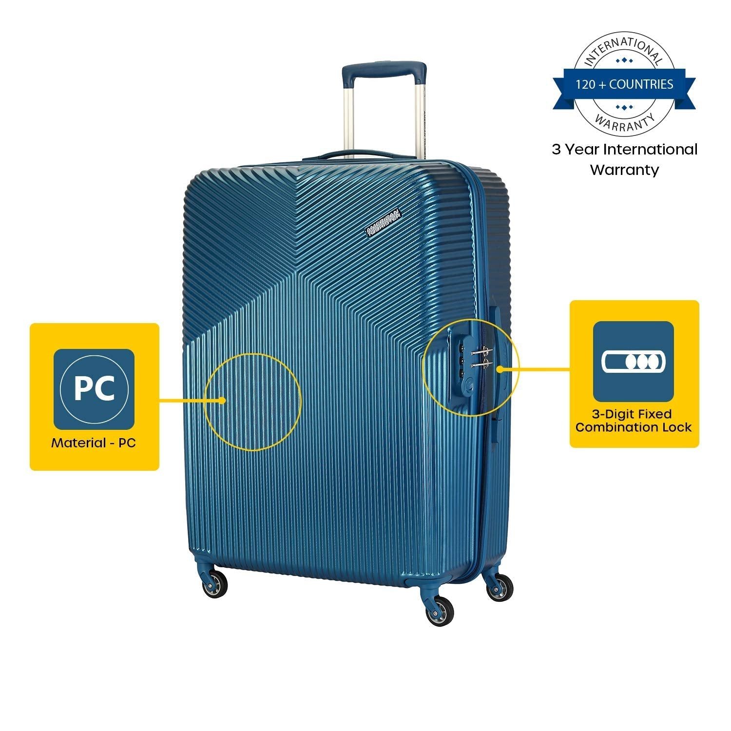 - Capacity: 108 liters; Weight: 4150 grams; Dimensions: 53 cms x 32 cms x 79 cms (LxWxH), Lock Type: Number Lock, Number of Wheels: 4, Number of compartments: 1