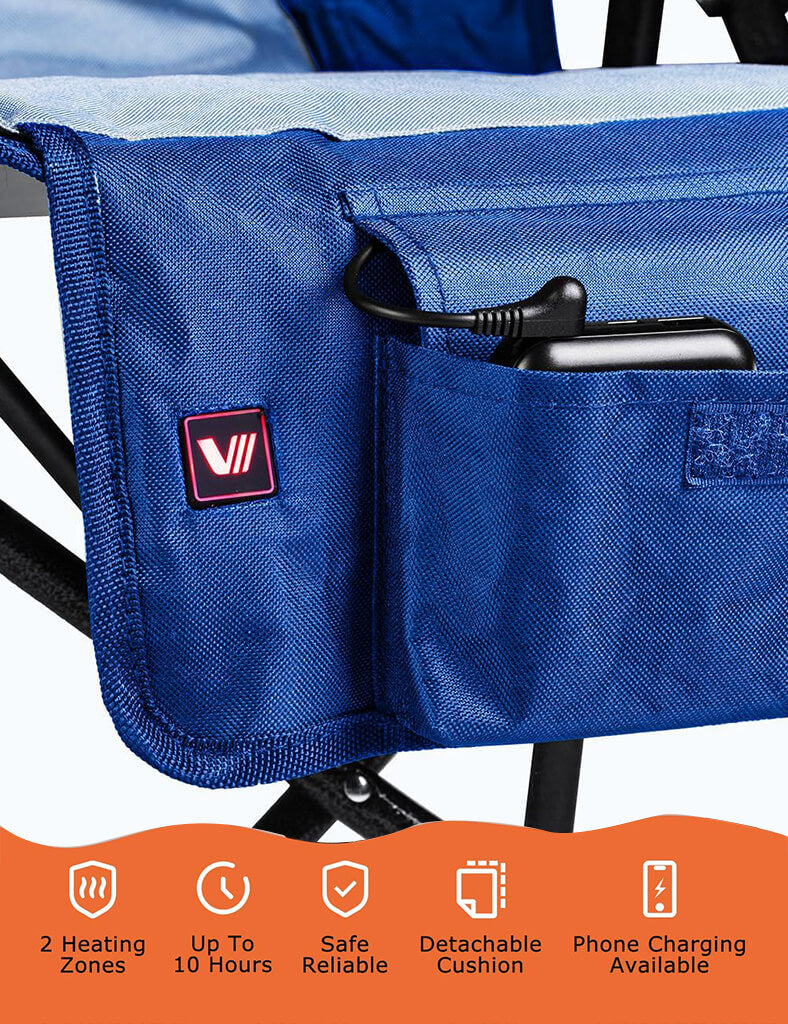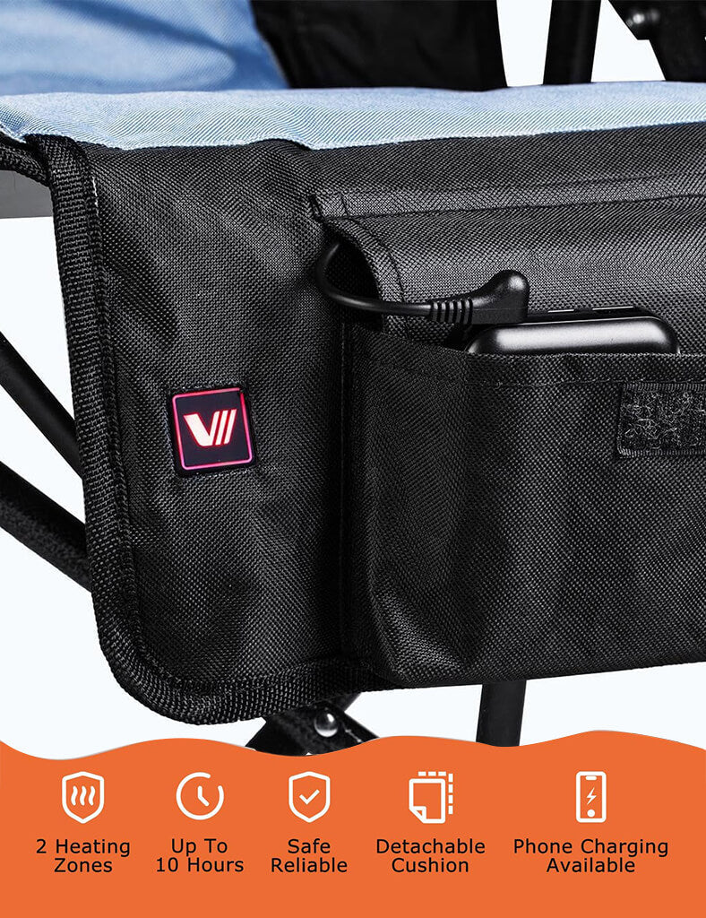 This heated chair uses carbon fiber heating technology and 7.4V lithium battery to distribute heat for up to 12 hours. Also, it’s a heated folding chair designed for easy portability, making it suitable for various outdoor activities.