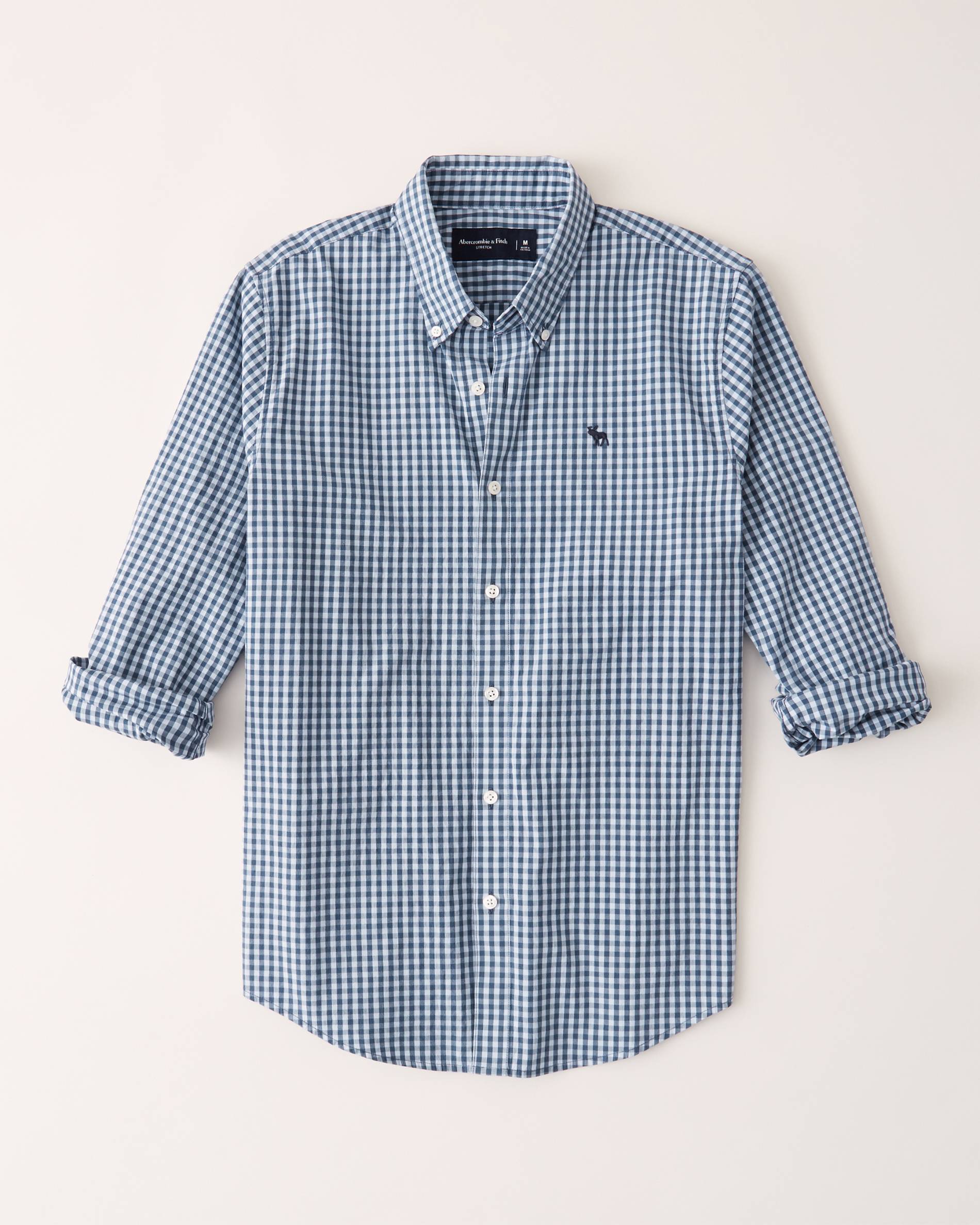 Classic button-up poplin shirt in a soft stretch-fabric with curved hem. Embroidered icon at left-chest. Imported