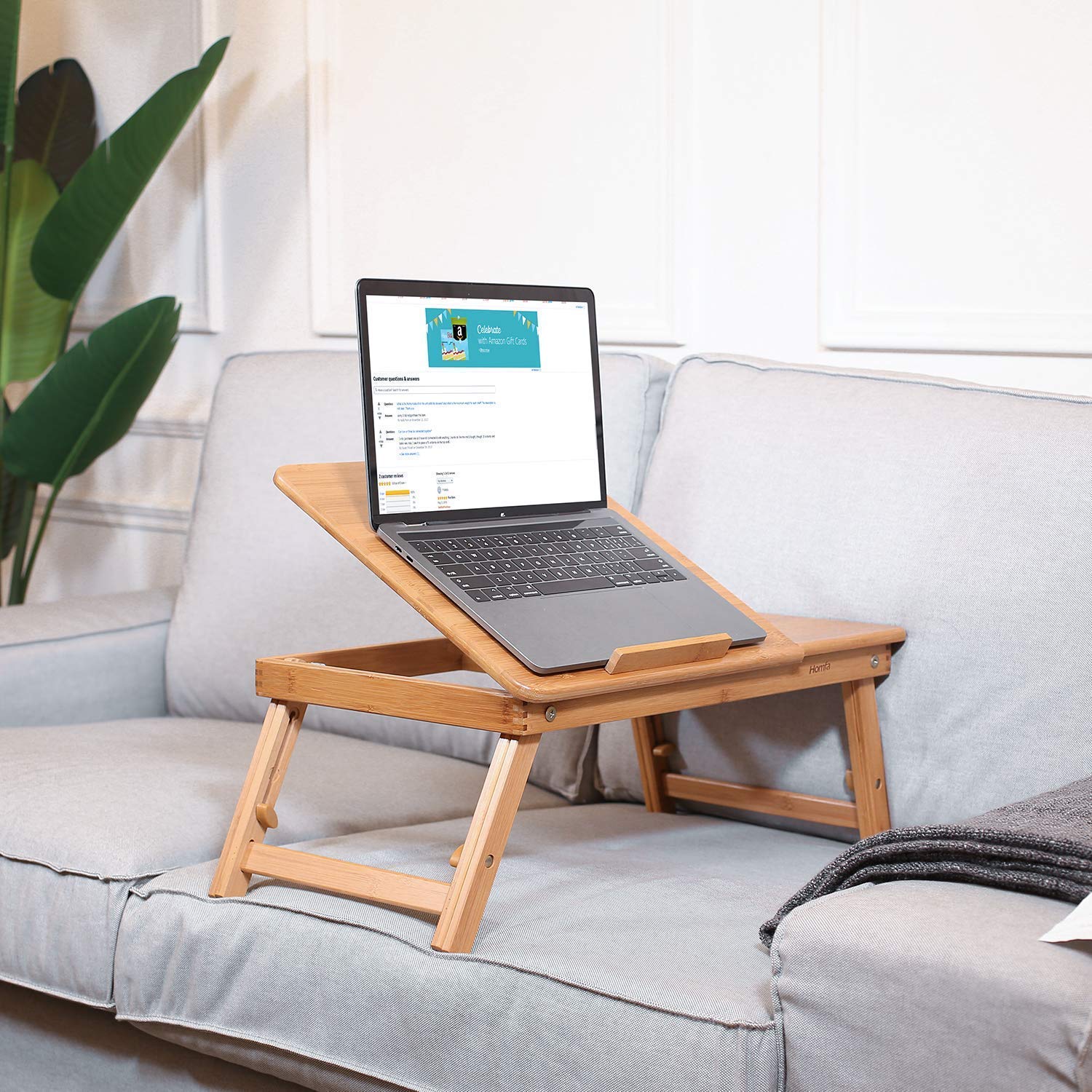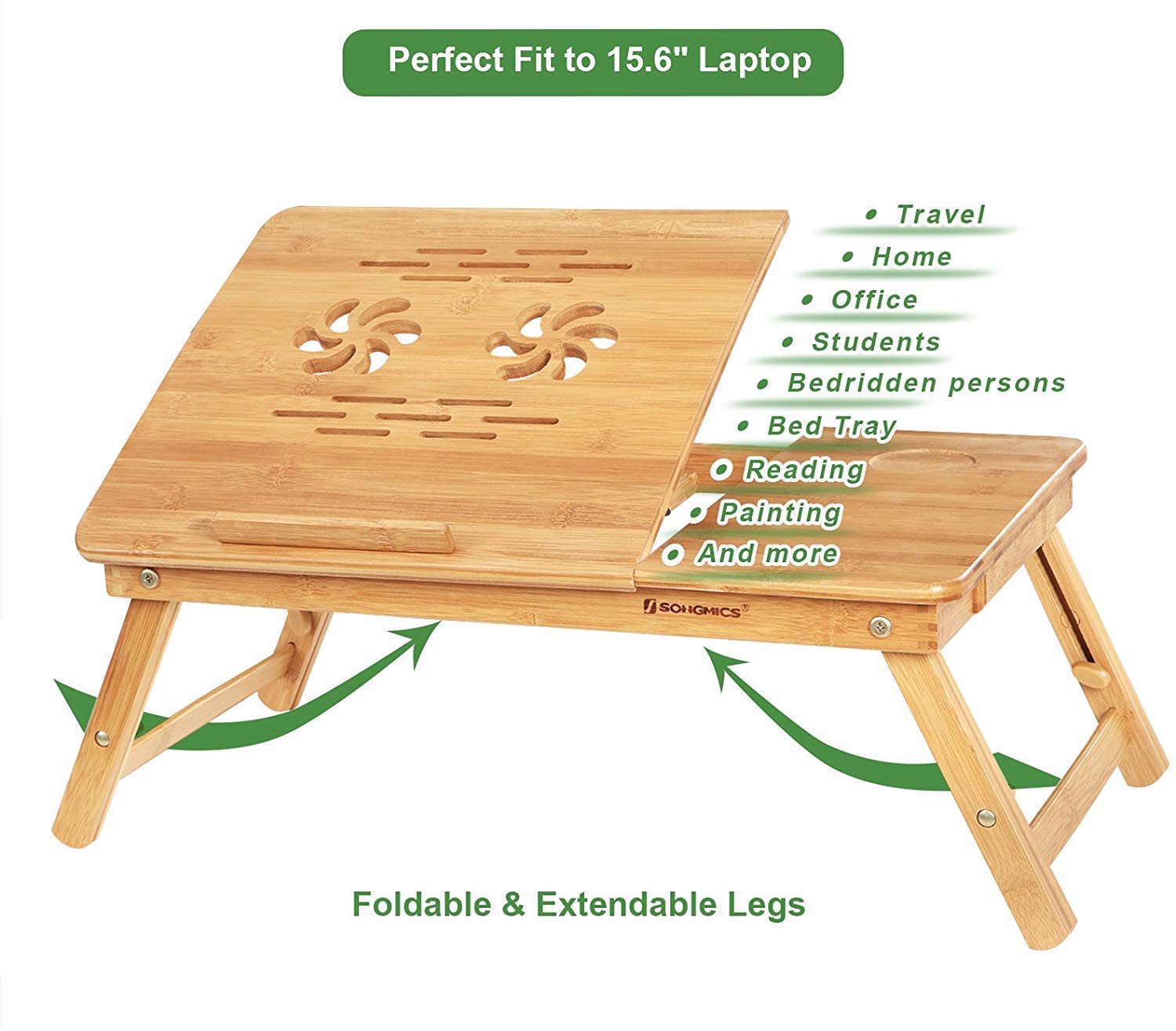 - This Jukkre bamboo laptop desk is well designed, durable, beautiful, and very adjustable. You can use it as a laptop table, reading desk or working desk or other usage. Unlike the tables used before, this portable lap desk with the new design, is more convenient for you to use in bed, or on the floor, sofa, car and many other circumstances.
