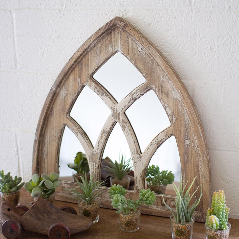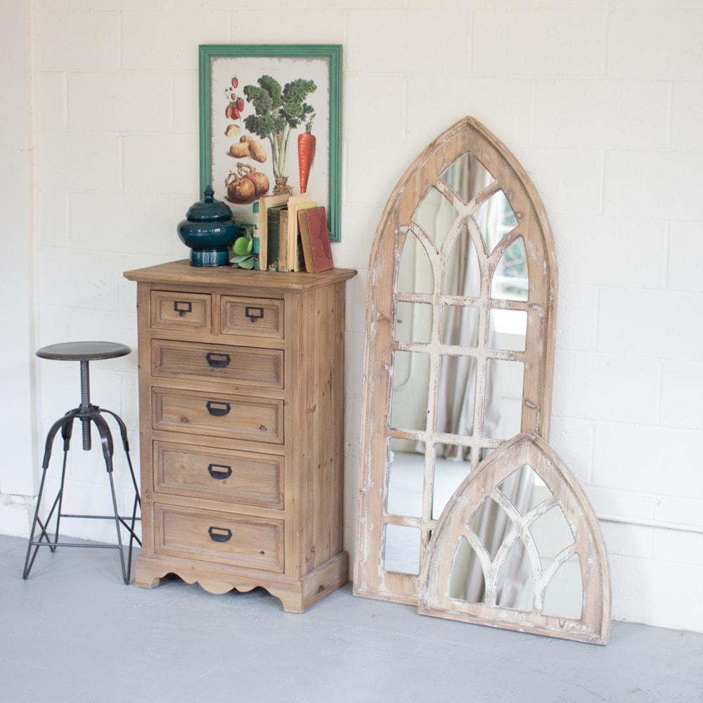 Create a sense of space by adding a mirror that will quietly reflect its surroundings anywhere in your home. This church mirror features a wide distressed wood frame with gently curved mullions for a Mediterranean addition to your eclectic decor.